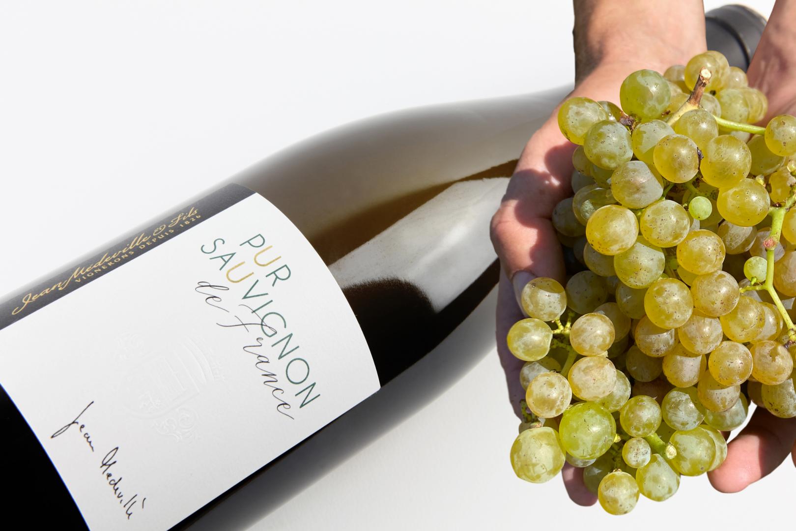 Le vin Pur Sauvignon des Vignerons J. Médeville, présente une robe jaune pâle.